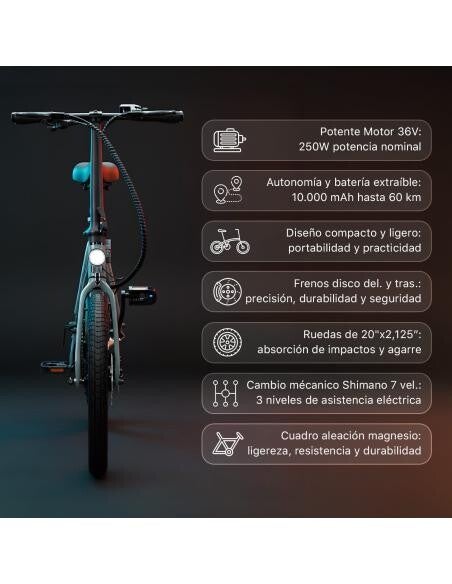 Su motor eléctrico de 36V con 250W de potencia, junto con una batería extráible de 36V y 10Ah, te permitirá recorrer hasta 60 km sin problemas.